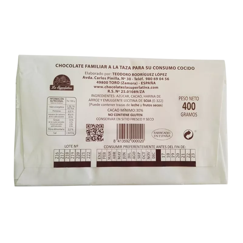 Vuelve a disfrutar del auténtico sabor del chocolate a la taza de toda la vida con «La Superlativa». Elaborado artesanalmente en Toro (Zamora) siguiendo la receta original de Vezdemarbán, cuna de chocolateros desde 1870. Una tableta perfecta para preparar un chocolate caliente espeso, cremoso y reconfortante, ideal para desayunos y meriendas especiales. Y además, ¡es sin gluten!
