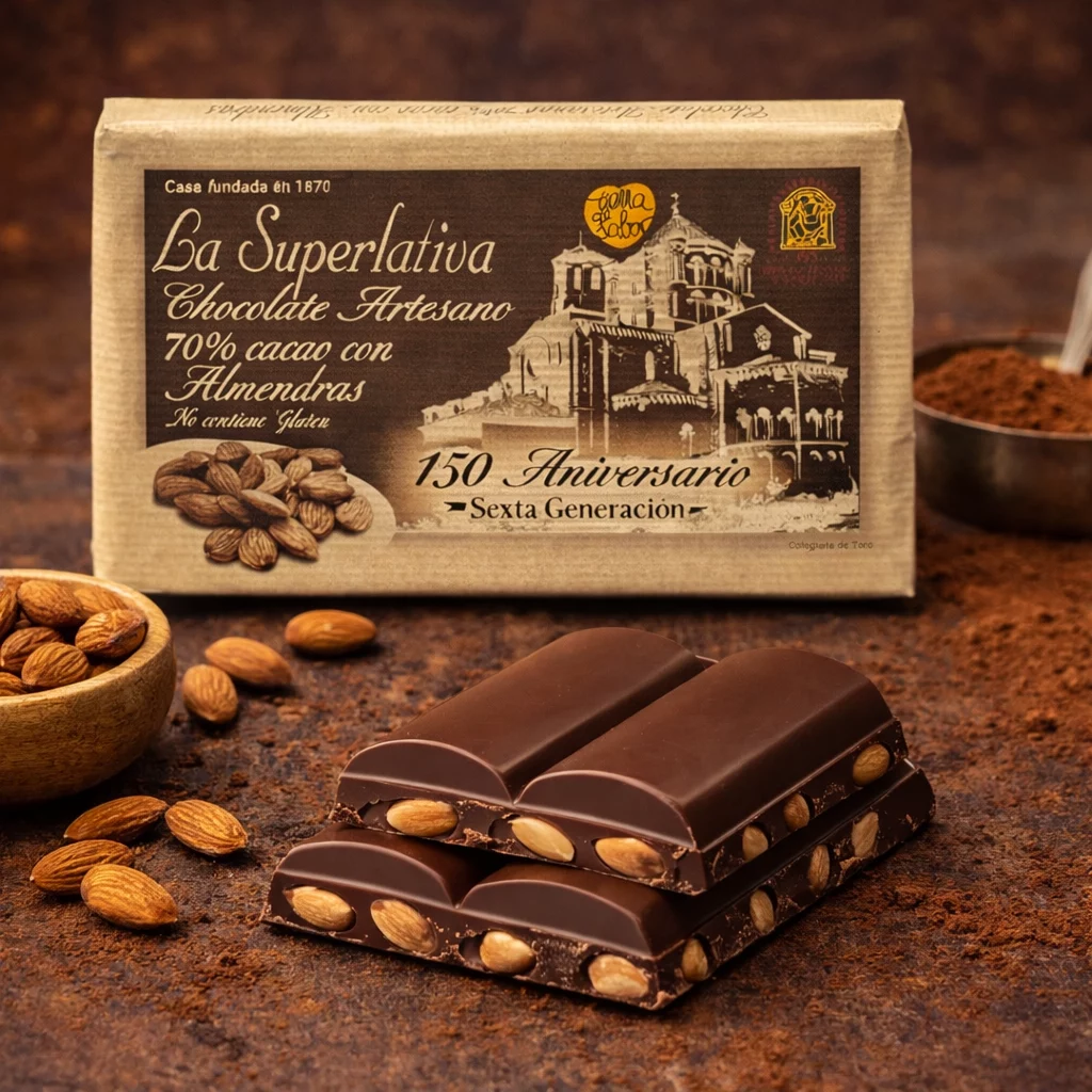 El Chocolate Negro 70% con Almendras de La Superlativa es mucho más que una tableta; es un pedazo de la historia gastronómica de Zamora. Su elaboración sigue procesos tradicionales que respetan el tiempo natural del cacao, logrando una textura y un brillo que solo la artesanía puede ofrecer.