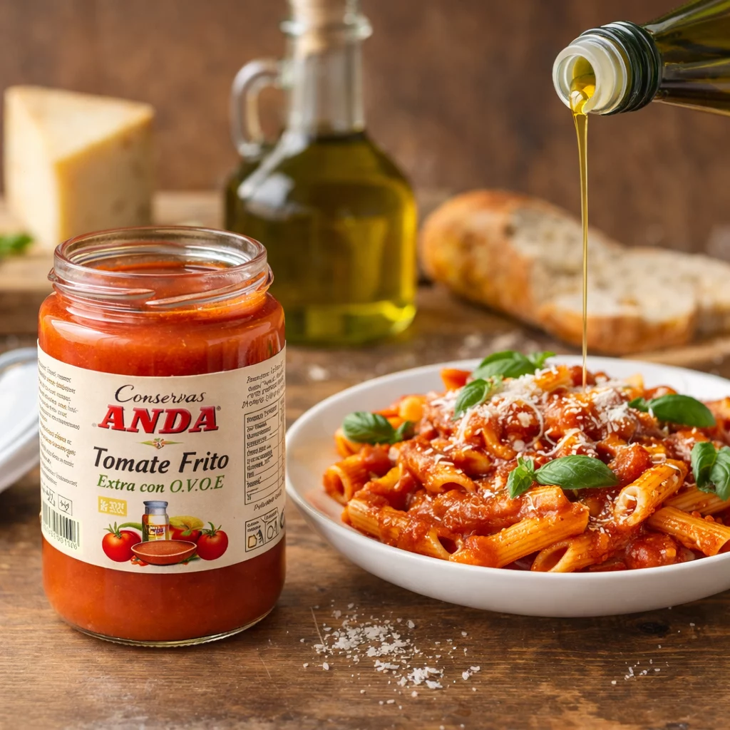 El Tomate Frito de Conservas Anda es el resultado de una elaboración lenta y tradicional que recuerda a las recetas de nuestras abuelas. Cultivados bajo el sol de Castilla y León, los tomates se seleccionan en su punto máximo de dulzor para evitar la acidez excesiva. El ingrediente que marca la diferencia en esta conserva gourmet es el uso exclusivo de Aceite de Oliva Virgen Extra (O.V.O.E.), que aporta una textura sedosa y un aroma inconfundible.